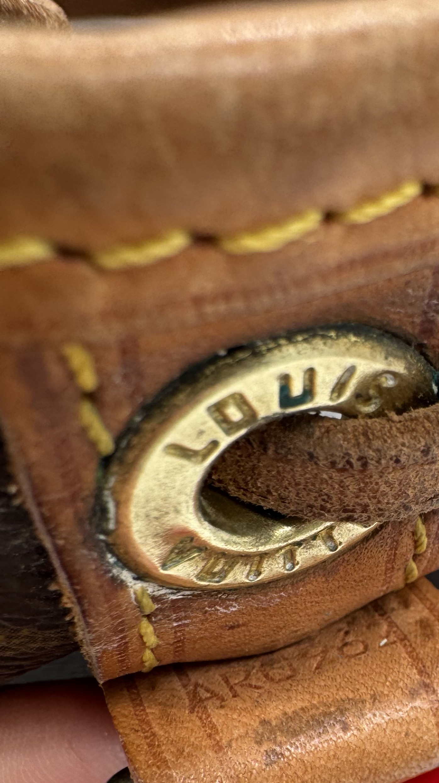 Lederteile sind gut erhalten und haben eine ebenmäßige Patina, mit Stellenweise leichten Flecken.